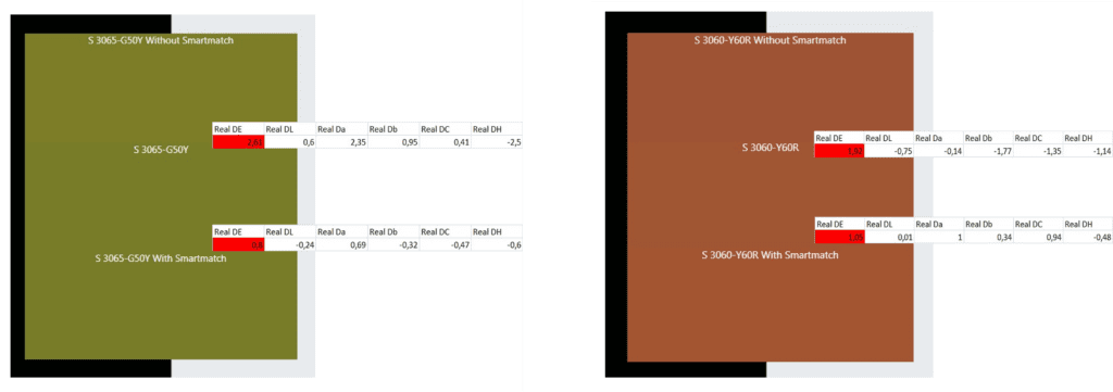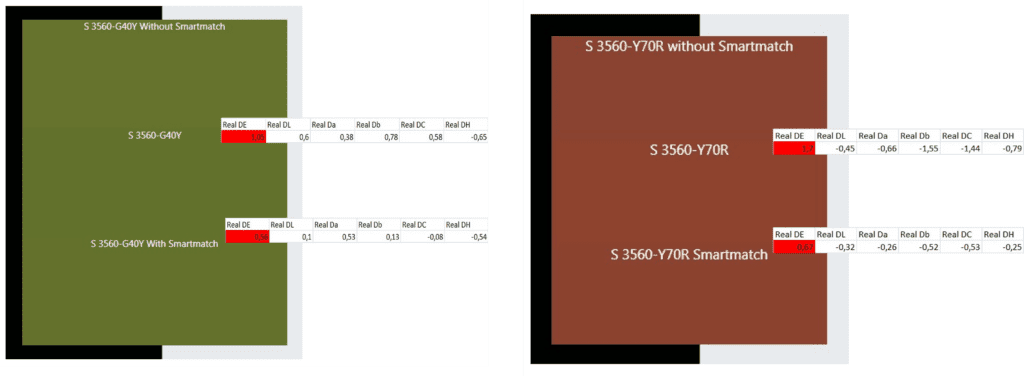 Through the above cases we can see that after using the smart color matching, the actual color difference of the first formula have been greatly reduced.