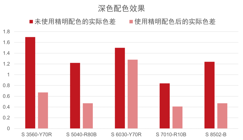 Meanwhile, through Chart 1, we can see that in the results of dark color matching, which is relatively difficult to match, the actual color difference of the first recipe is reduced by 50% on average after enabling the smart color matching function.