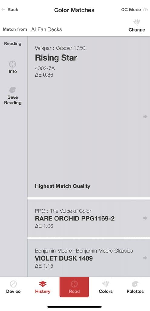 Die ColorReader EZ-App hilft dem Anwender dabei, kritische Farbentscheidungen sicher zu treffen. Nach der Messung einer Farbe mit dem Gerät schlägt die ColorReader EZ-App Farben vor, die die gemessene Farbe perfekt ergänzen, und bietet koordinierende Farbschemata wie Komplementär-, Dreifach-Schema-, analoge und monochrome Farbabstimmungsvorschläge an.