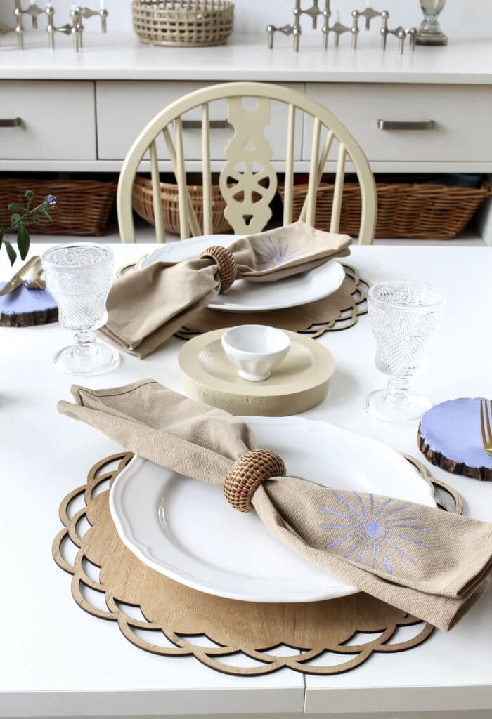 Como retomar los colores en un concepto de decoración consigue un ambiente armonioso y encantador, Moni decidió pintar algunos de sus pequeños discos de árbol en el tono azul de los astros y también decoró algunas servilletas de mesa.