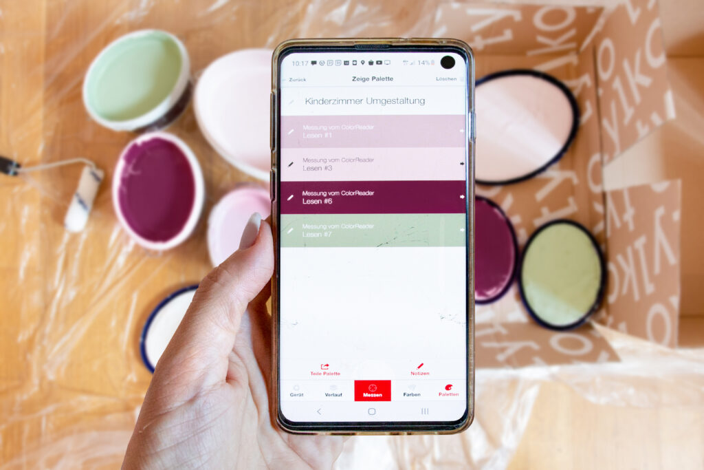Como ya hemos dicho, nuestro punto de partida y, por tanto, fuente de inspiración para nuestra combinación de colores fue la ropa de cama favorita de Luise, que puedes ver en las siguientes fotos. En realidad, no sería fácil encontrar los mismos tonos exactos de las pinturas y barnices de pared en una ferretería. A no ser, por supuesto, que uno tenga este pequeño ayudante con el que estoy totalmente encantada.