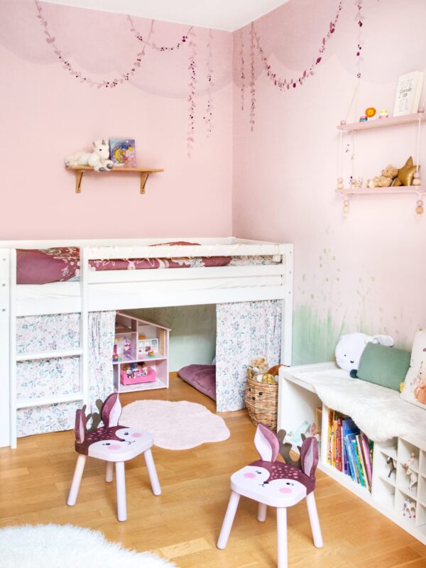 La habitación infantil de mi hija Luise ya debía haber sido transformada, después de todo, ya tiene cinco años y quería una verdadera habitación de niña y no de bebé, como solía llamarla. Su nuevo reino debía parecer un claro de bosque mágico, con los colores de su ropa de cama favorita: rosa, morado, verde y burdeos. Y los motivos de la misma también debían figurar en el diseño: Cervatillos, enredaderas florales y bayas silvestres moradas.