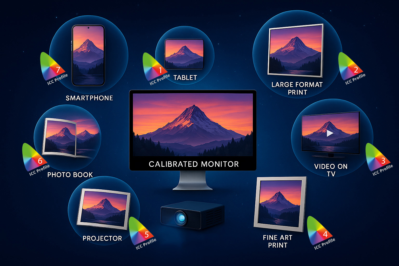 Every output medium—print, video, fine art, tablet, and more requires Its own monitor calibration. Your monitor acts as the central workspace where all output media is simulated. Since these media differ fundamentally in their physical properties, there is no single monitor setting that works for everything.